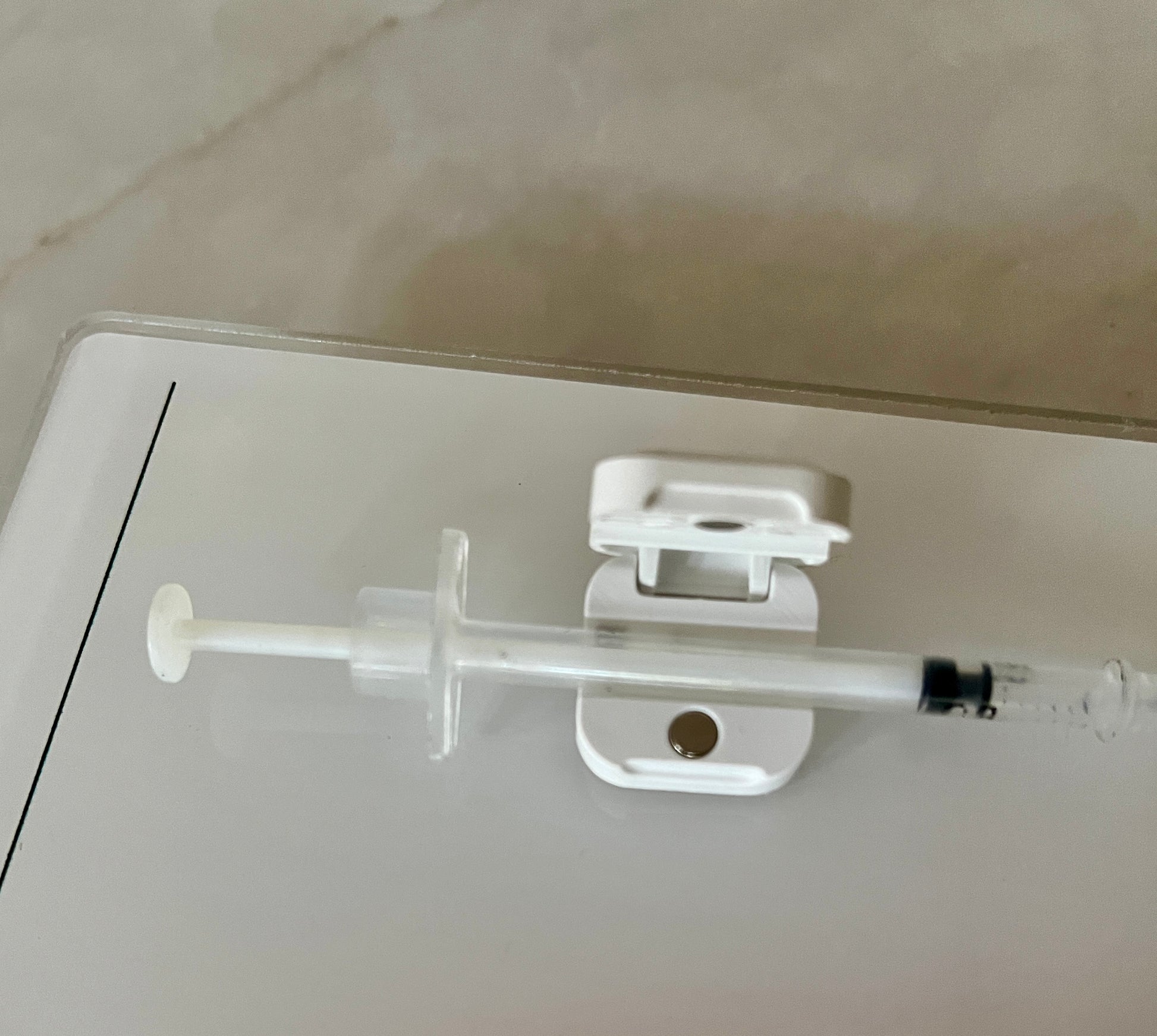 These updated clips are adhesive and have a small magnetic clasp to secure the syringe on the BRIVO board. 5 in a pack (syringe not included).