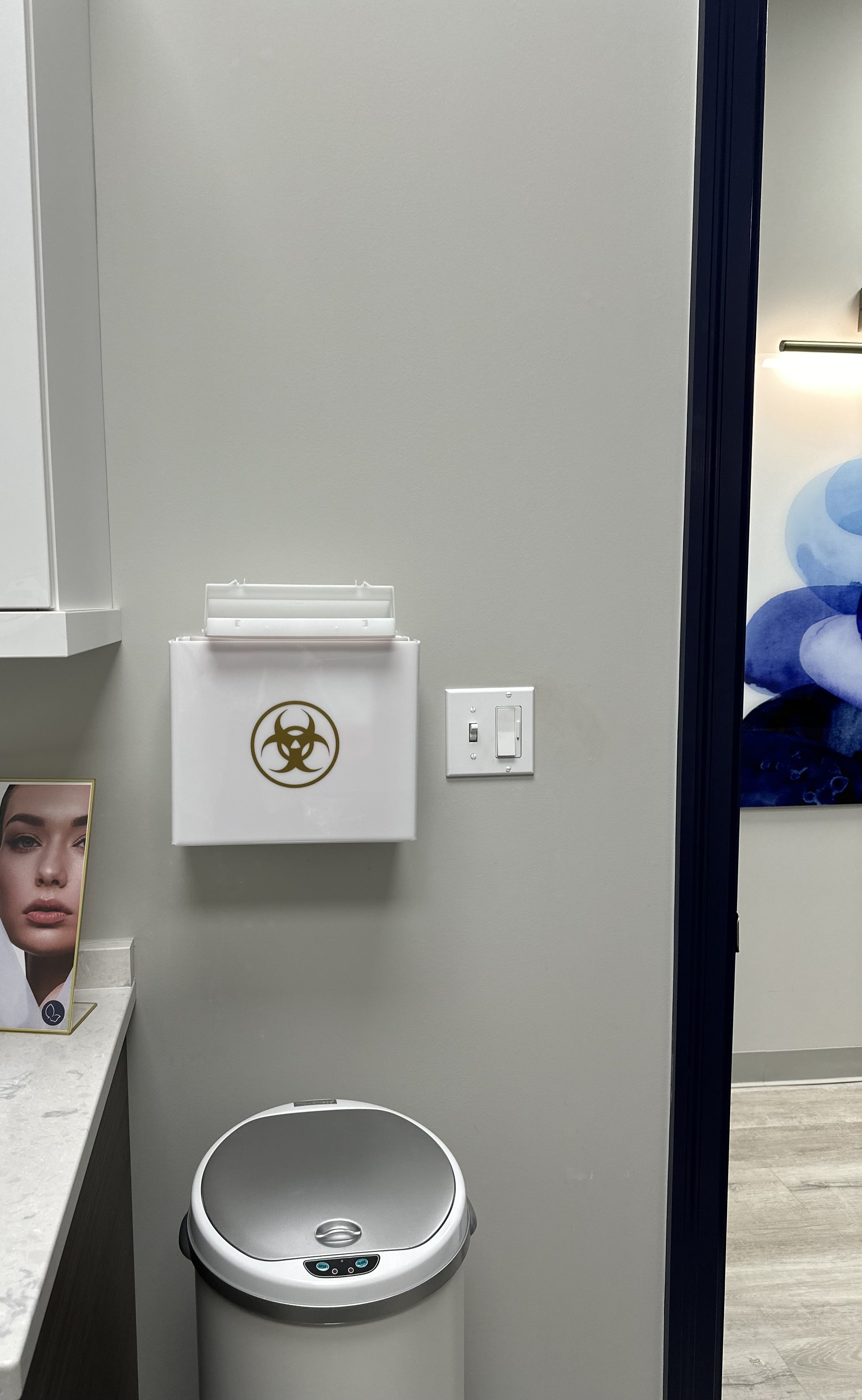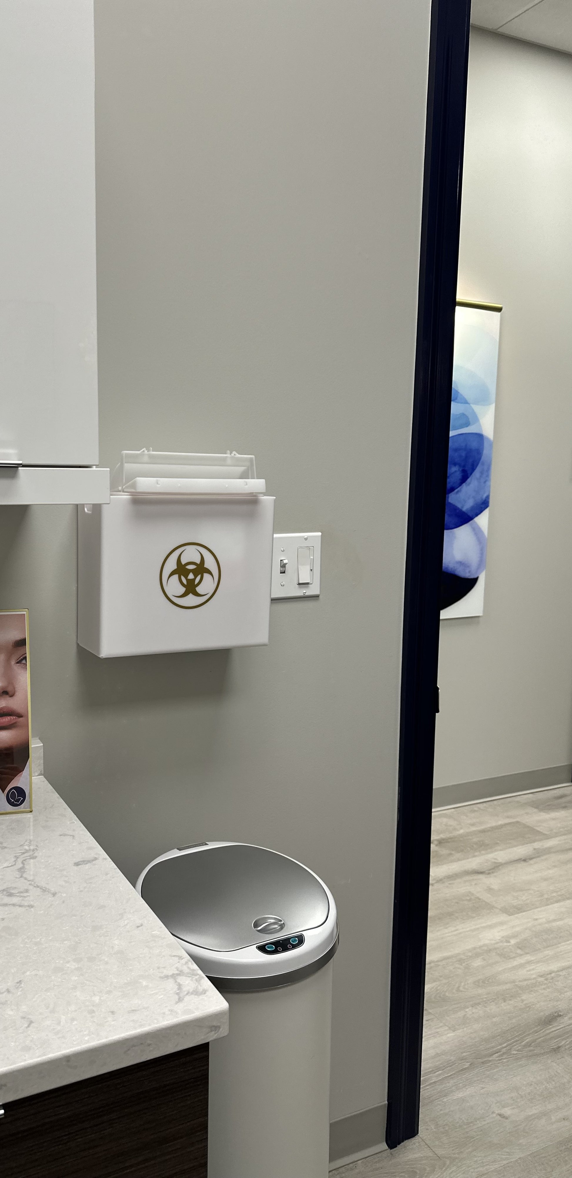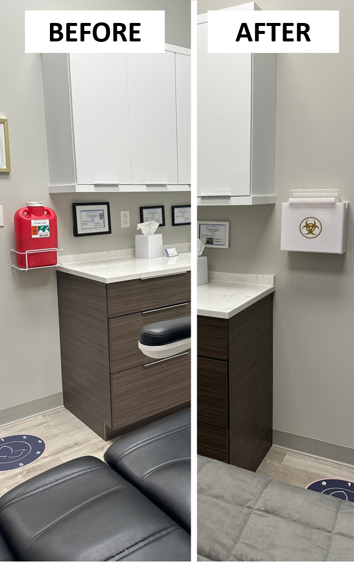 Keep your space looking beautiful, clean, and sleek while prioritizing safety with the new bioBox. Some practices keep those unsightly red sharps bins on desks or in the wire cages on the wall. Now, you can enhance the look of your rooms with a functional cover for those red bins. Anchoring the bioBox to the wall helps prevent spillage and accidental exposure to needle sticks.