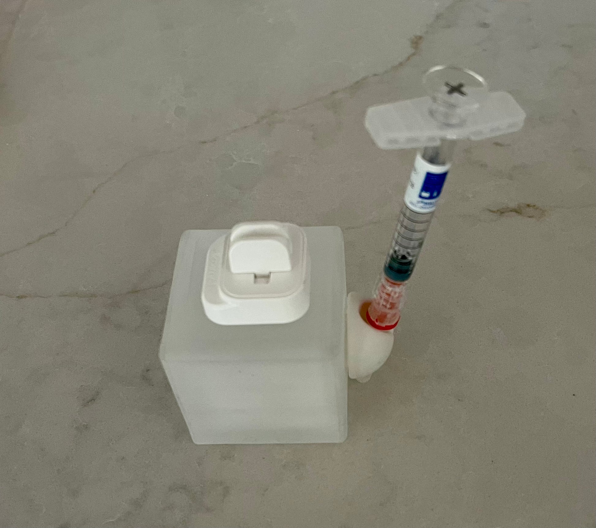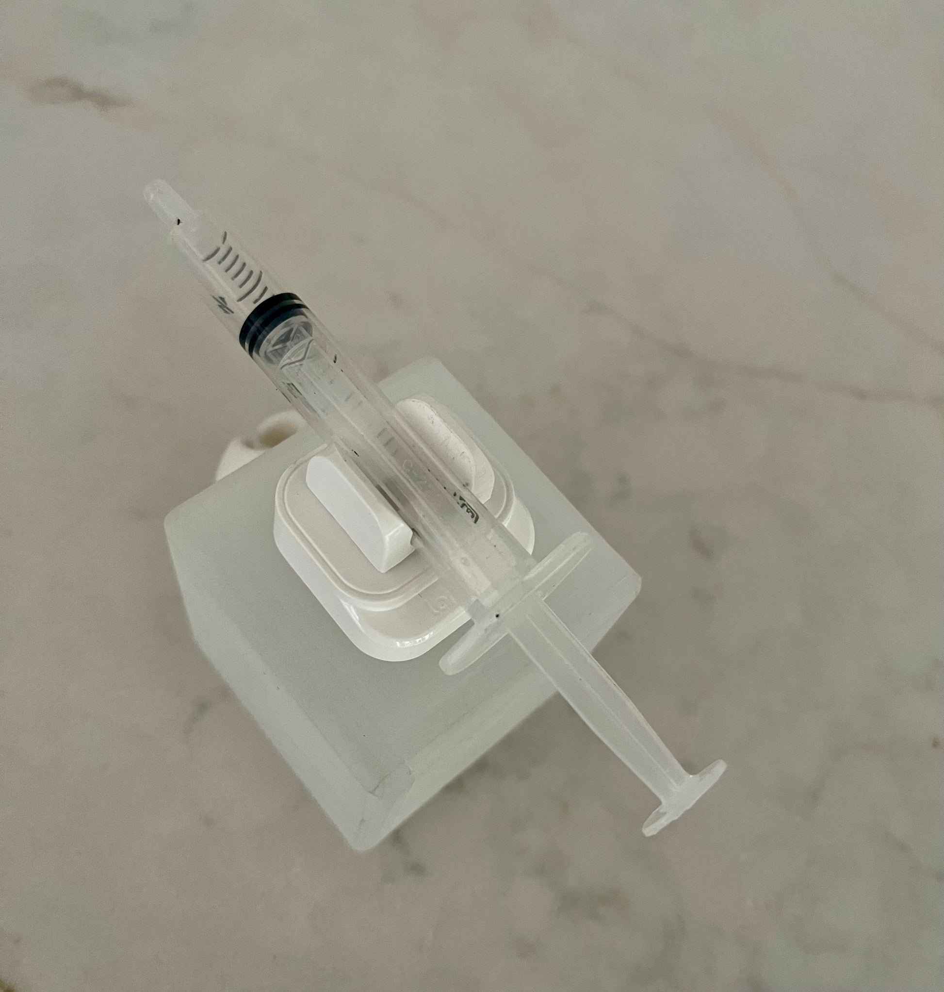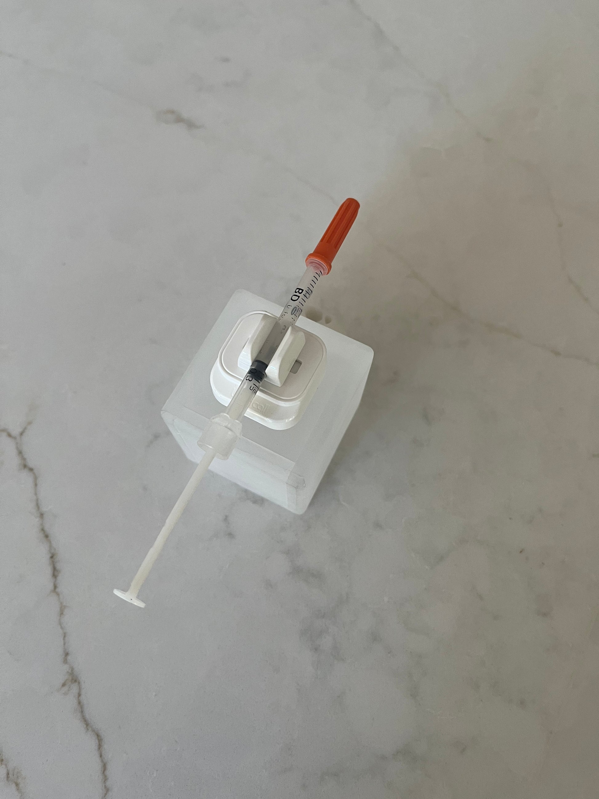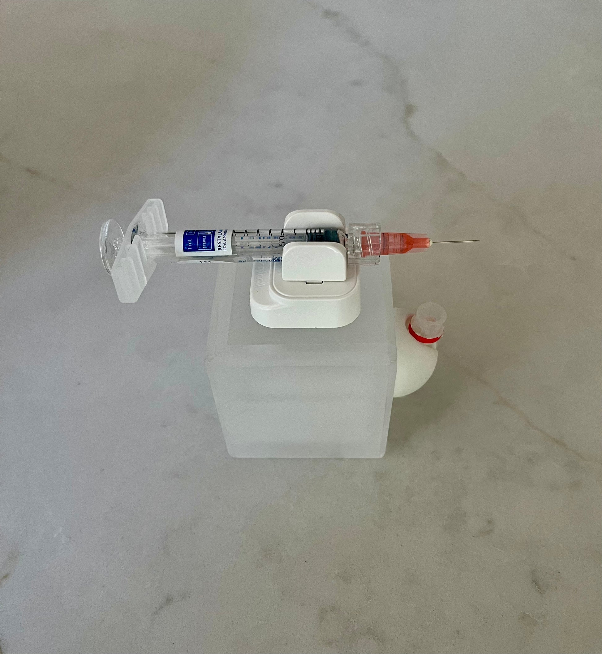 No more setting syringes on trays and napkins or using single syringe holders that could increase risk of contamination. Secure your syringe and reduce risk of contamination. A new patent-pending syringe holder that helps organize and securely hold a single syringe of all sizes up to 1/2 inch diameter. Uncap the syringe and clip onto the cube.