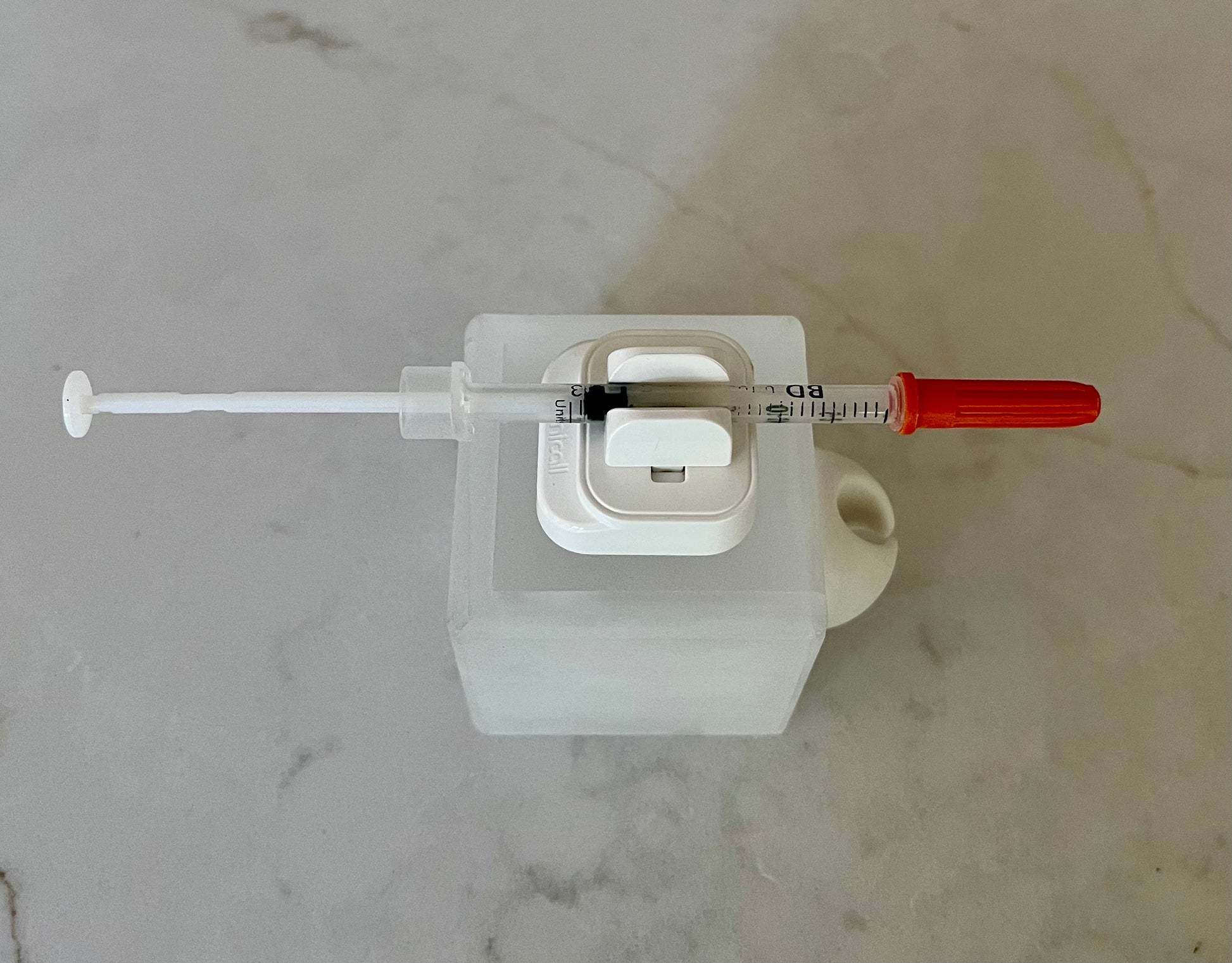 Designed to securely hold but easily un-clip the syringe with one hand. Commonly used to hold 0.3 cc to 10 cc syringes. Holder size is 2" x 2" x 2" and can be cleaned using anti-bacterial wipes and wiping down with common cleaners.